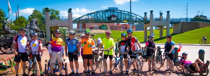was a bike tour of Tulsa. A dozen riders, led by OBS member Robert Abbott, enjoyed a 25-mile trip along Tulsa’s river trails and downtown area. Robert arranged for lunch at the Spaghetti Warehouse, with special concierge bike parking inside the warehouse. Below is the group posing in front of the Route 66 gateway to Tulsa. Even though part of the river trail is closed for a new park, Robert was able to steer the group around the construction.